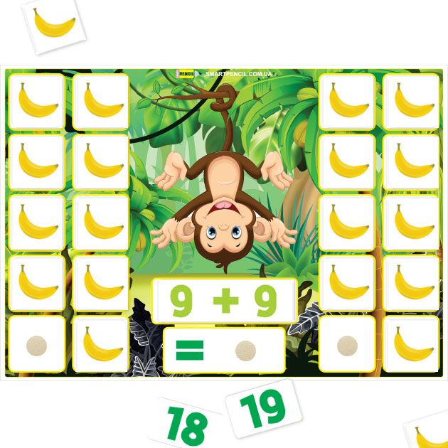 Додаємо разом з мавпочкою банани. Беремо приклад і кріпимо відповідне число бананів кожному з доданків, зліва та справа. Рахуємо скільки вийшло разом. На звороті прикладів правильна відповідь.