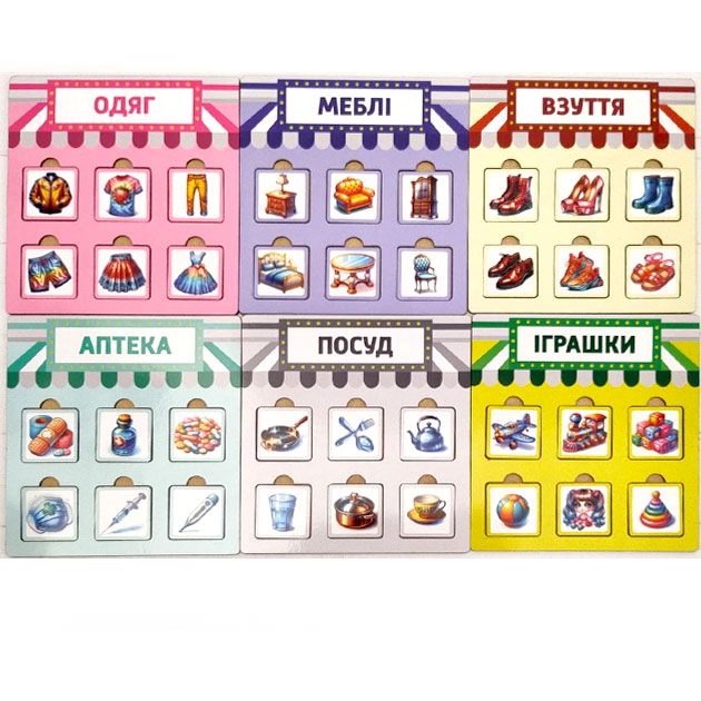 (Аптека, одяг, взуття, меблі, іграшки,посуд)