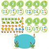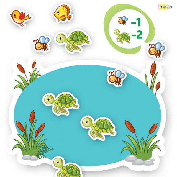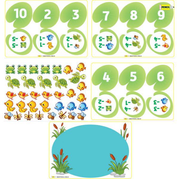 Оформлена гра у вигляді ставка, а на фішках зображені тварини. Правильні відповіді розміщені на зворотних сторонах карток. Вона допоможе швидко і злагоджено вважати, що буде корисно для майбутнього навчання.