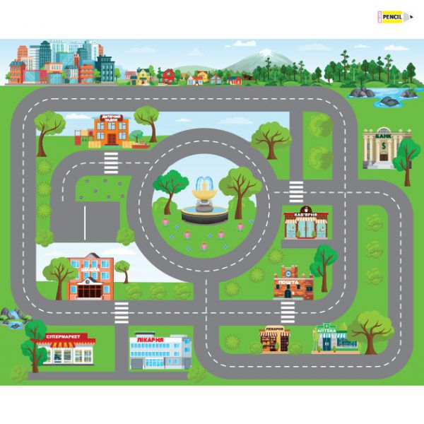 Килимки з дорогами є прекрасною основою для створення чудових ігрових світів. На карті є аптека, школа, садочок, лікарня, супермаркет, пошта і т.д. Килимок виготовлений з щільного вінілу, його можна протирати вологою серветкою, а також грати на ньому з піском.