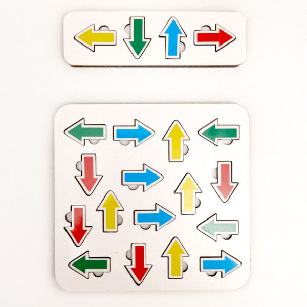 Гра “Порядок”. Розкладіть усі стрілочки на столі та запропонуйте дитині розмістити їх на підставі планшета в будь-якому порядку. Попросіть розмістити стрілочки таким чином, щоб, наприклад, сині стрілочки «дивилися» вгору, зелені вниз, червоні вліво, жовті вправо і т.д. Запропонуйте розкласти кожну стрілку у певному напрямку.