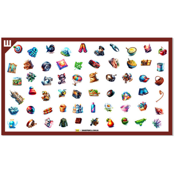 В набір входять килимок 70х 40см, 3 рамки, картка з переліком слів