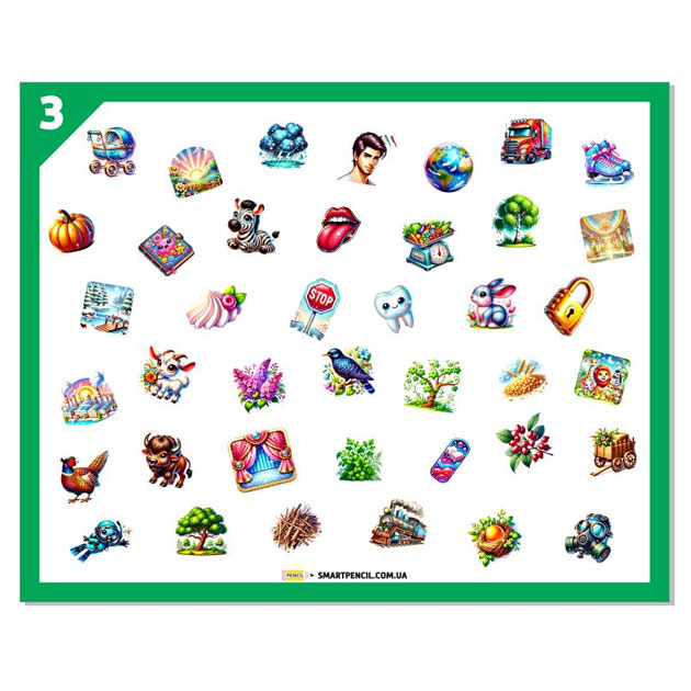 В набір входять килимок 50х 40см, 3 рамки, картка з переліком слів
