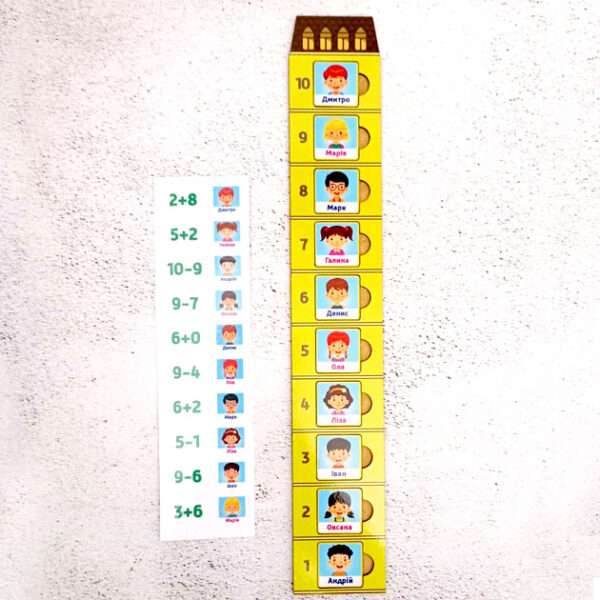 5 двосторонніх карток з прикладами, посадку пасажирів виконуємо відповідно відповіді в прикладах. 1 карта пуста для самостійного заповнення. Також можна використовувати усні інструкції(Андрій живе на 3-му паверсі, а Оксана 2-ма поверхами вище)