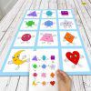 Дитина повинна притримуватись “маршруту”. Також можна показувати маршрут спочатку, і вже по ппам’яті його проходити. Самим маленьким можна просто стрибати по формам та називати їх. В набір входить ламінована картка для побудови маршруту та маркер.