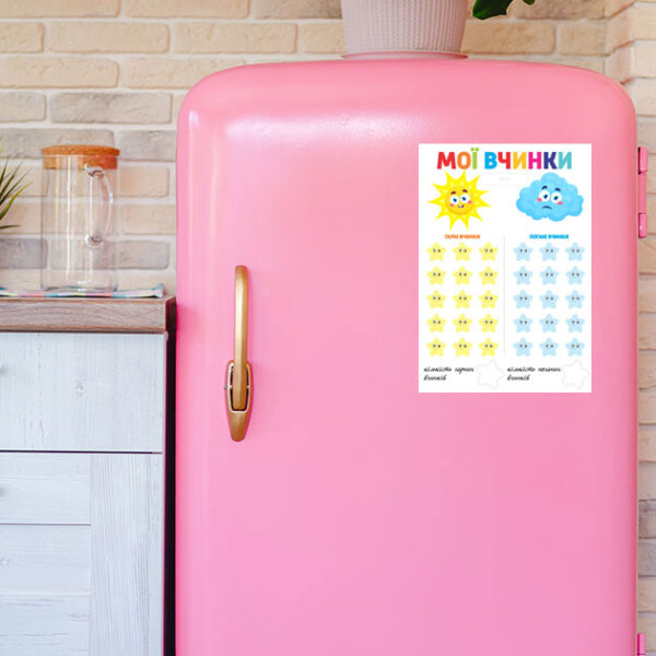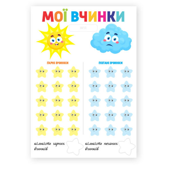 Мета даного посібника — введення дитини до культури стосунків між людьми, взаємодії з навколишнім світом, що є початковим етапом емоційного виховання. Візуалізація допоможе дитині розпізнавати добрі та погані вчинки. Якщо поганий вчинок(поведінка), то малюємо сумну посмішку блакитній зірочці, гарний- веселу посмішку жовтій зірочці. Ввечері рахуємо зірочки та аналізуємо поведінку за день.