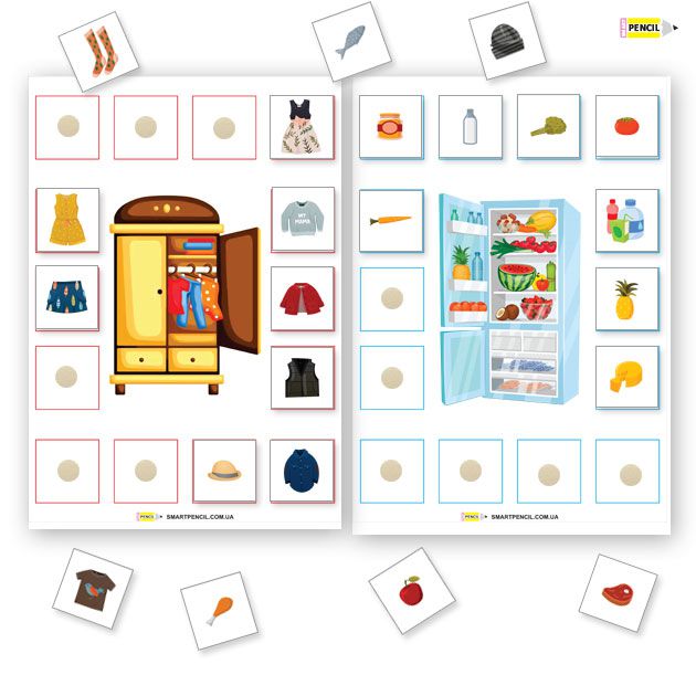 Беремо картинки із зображенням шафи і холодильника. Покажіть дитині маленькі картинки