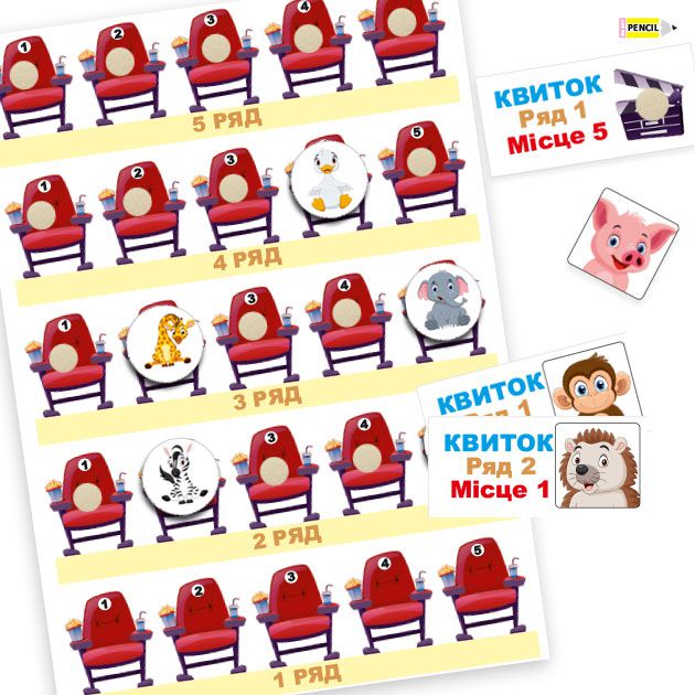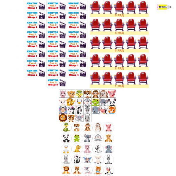 Гра на увагу. Спочатку кожна тваринка отримує квиток і потім відповідно розміщаємо тварин в залі. Друкуємо кількість наборів відповідно кількості дітей. Можна грати наввипередки