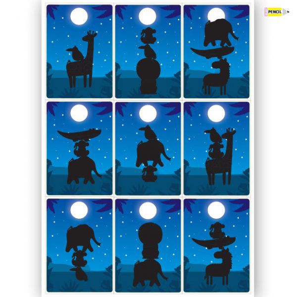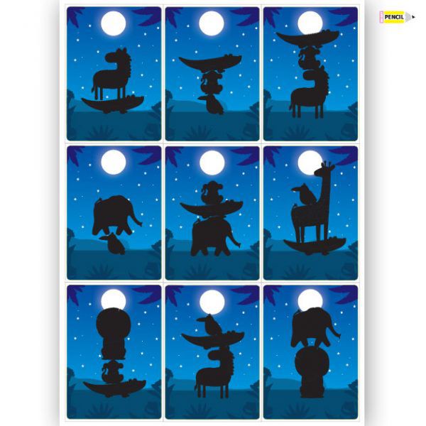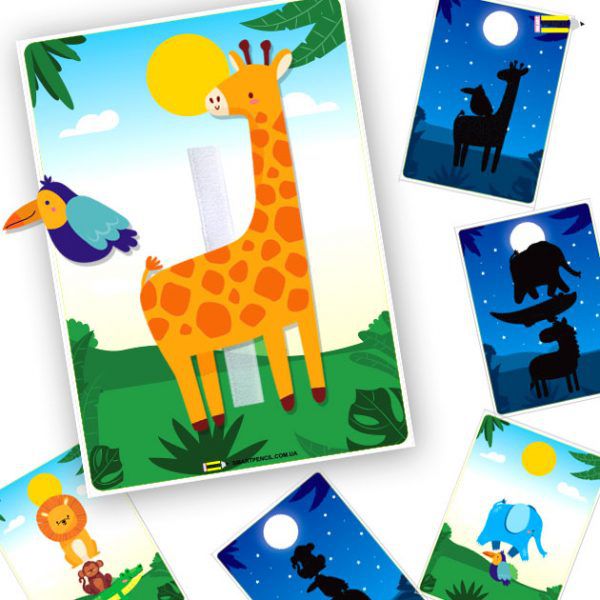 Збери веселу компанію звірів по зразку тіні вночі, та перевір на звороті картки вдень.